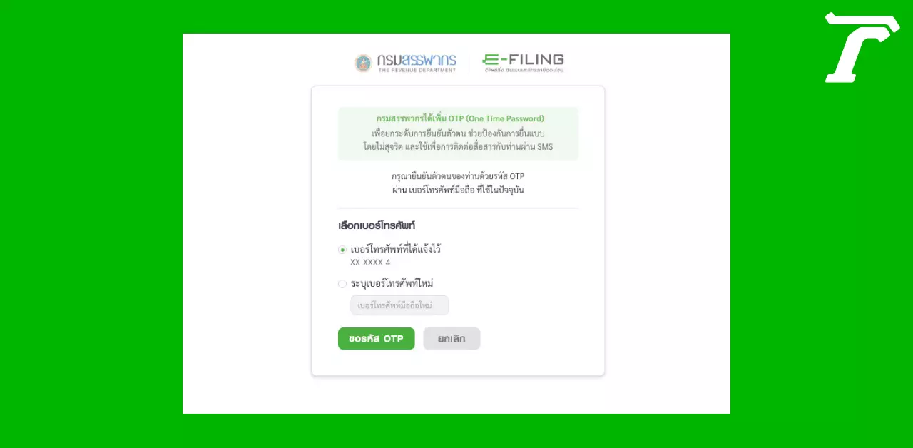 หลังจากกรอกรหัสผ่านแล้วจะมี OTP เข้าสู่หมายเลขโทรศัพท์ที่ให้ไว้กับเว็บไซต์กรมสรรพากร ให้นำเลข OTP นั้นกลับมากรอกที่หน้าเว็บ