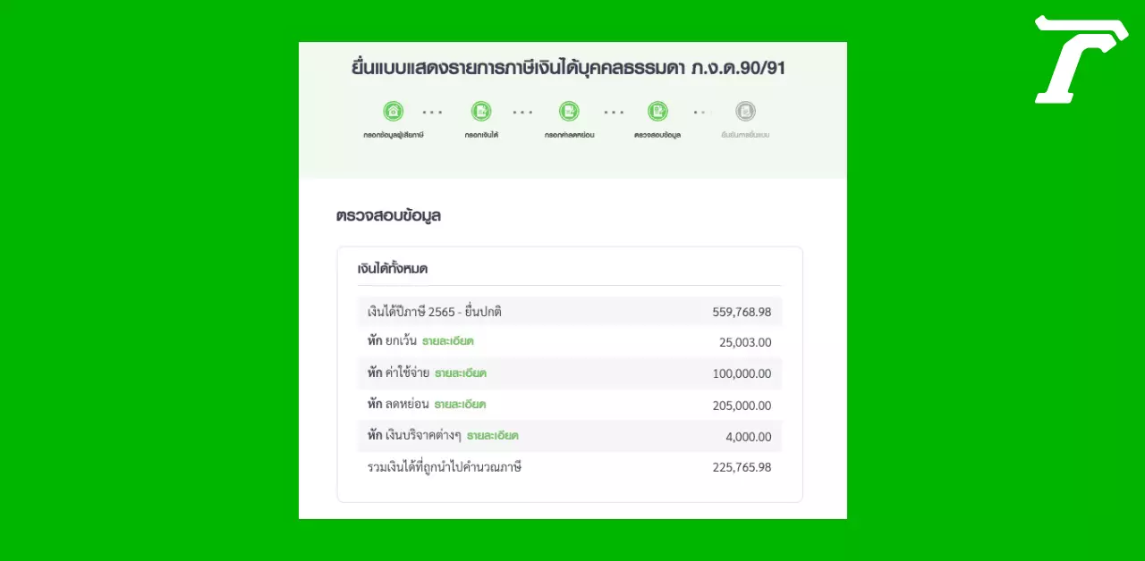 ขั้นตอนสุดท้าย ตรวจสอบรายการเงินได้ทั้งหมด และการหักลดหย่อนภาษีต่างๆ ตั้งแต่ค่าใช้จ่ายส่วนตัว ค่าลดหย่อน เงินบริจาค และเงินที่หักภาษี ณ ที่จ่ายเอาไว้